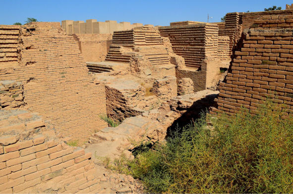 Wykopane ruiny Babilonu, VI wiek pne. W tle kompleks świątynny zrekonstruowany na zlecenie byłego przywódcy Iraku Saddama Husajna.