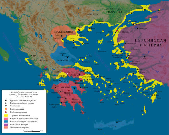 Grecja i Azja Mniejsza w przededniu wojny peloponeskiej (431 pne). Ateny stanowią liczne, stosunkowo niezależne kolonie greckie