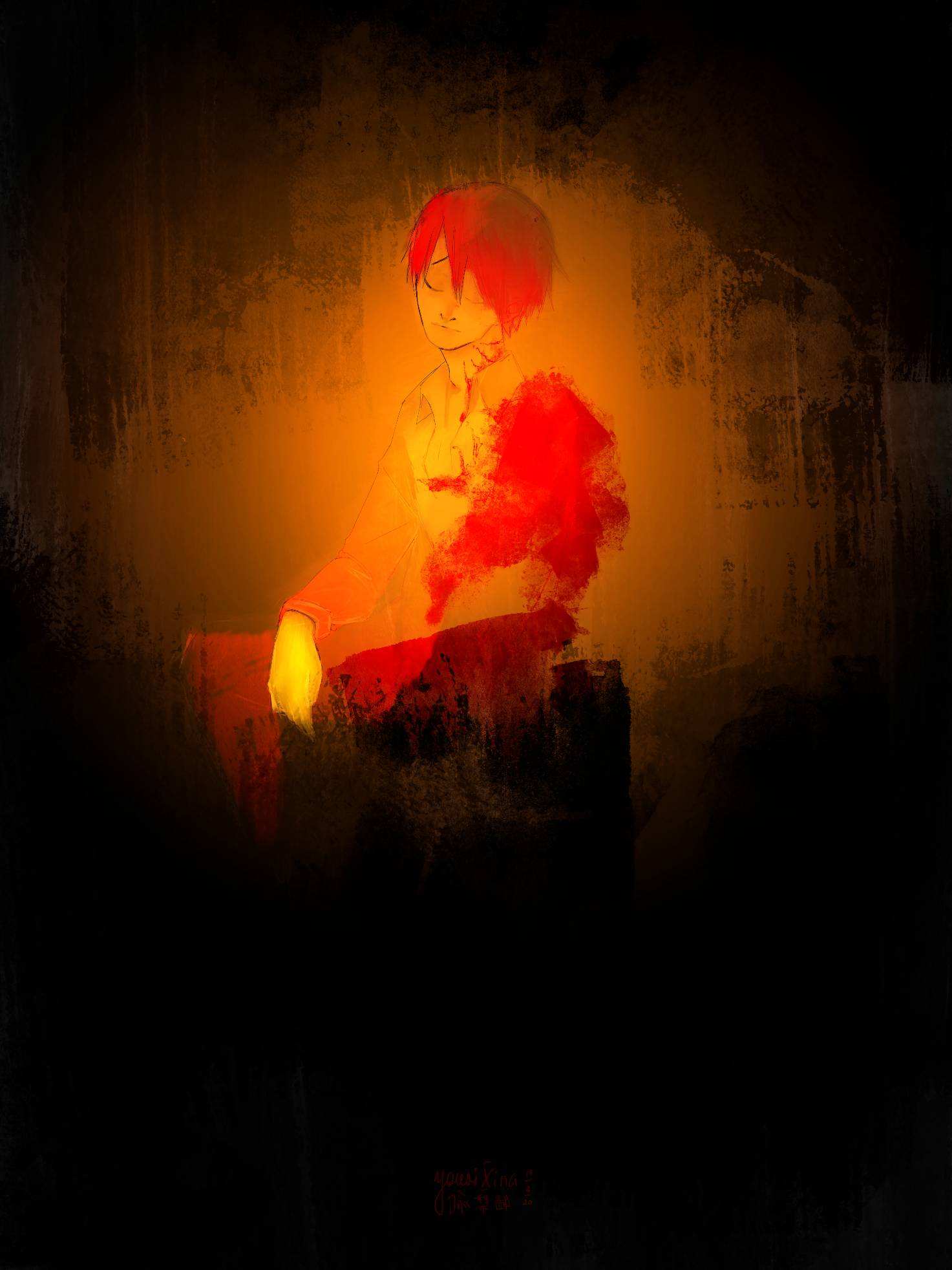 Брюнета, уже усыпающего на ходу, неожиданно усадили на диван, хоть и видавший виды, но ещё пригодный к использованию. Сейчас парень явно не был настроен на разговоры и с учётом того, что прятаться было не от кого, он всё же завесился чёлкой и сидел, опустив голову из-за подступавшей дрёмы. Ниум, выбирая ракурс для рисунка, пристроился с холстом у стены напротив и светло-бежевой пастелью принялся намечать основные линии. Свет от лампы, искусственный, сейчас ему был не по душе и парень выставил свечу рядом на столе и зажёг от карманной зажигалки. В этом антураже он запечатлел, что видел. С резкими тенями на фоне фиолетовых почти чёрных стен, дорогой ему человек сиял, подсвеченный тёплым огнём.