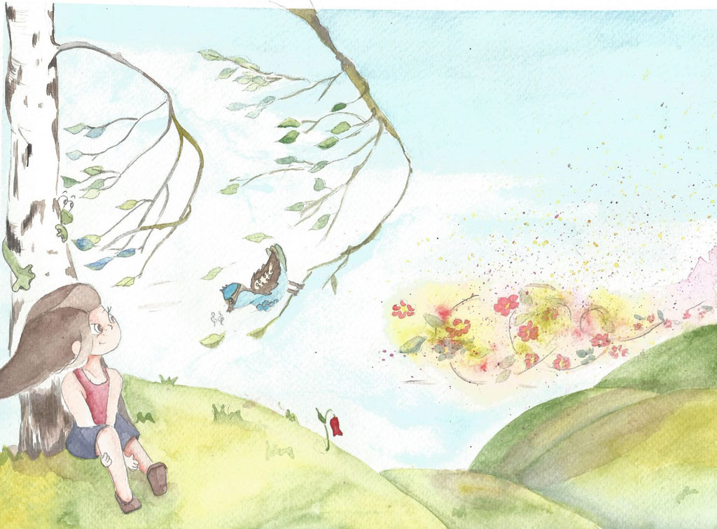Набив таким способом полные карманы, Рита вприпрыжку побежала к старенькой, поросшей лимонником беседке в глубине сада искать лягушек, но вдруг замерла на месте и резко подняла голову: ура, опять налетел сильный ветер! Рита помчалась к задней калитке. Прямо за ней начиналось большое, почти бескрайнее поле; на поле росло несколько берез.