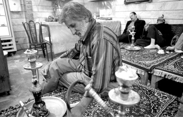 Вечером Мортеза повез нас осматривать достопримечательности. Безбрежный плач по имаму Али неизменным саундтреком проникал везде. Следующая сцена, случившаяся в полутемной дымной чайхане, разыгралась тоже под аккомпанемент плача. В темноте, среди змеевидных трубок кальянов и разноцветных персидских ковров на больших скамьях полулежали люди. Семейный ужин в дымной забегаловке – в порядке вещей. Мы сняли обувь и влезли на одну из лежанок.