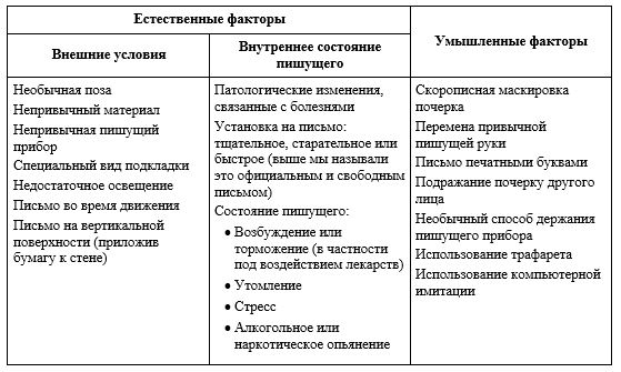 При ситуационном анализе эксперты оценивают условия и обстановку выполнения рукописи, а также, возможно, и обстоятельства. Эти факторы влияют на почерк и приводят к его изменению. Почерковеды называют их «сбивающими факторами». Некоторые факторы, влияющие на почерк, были уже рассмотрены выше. В контексте почерковедческой экспертизы они могут быть систематизированы несколько иначе (Серегин, 2014). Сбивающие факторы можно подразделить на две группы: