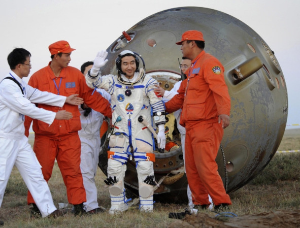 Аннотация снимка: «На этой фотографии, опубликованной китайским информационным агентством Синьхуа, тайконавт Чжай Чжиган машет рукой после выхода из модуля повторного входа в Шэньчжоу-7 после его приземления в 2008 году. Во время миссии Чжай провел первый в стране выход в открытый космос. (Ли Ган / AP)». [9] На поверхности капсулы отсутствуют характерные полосы копоти, которые обязательно проявляются в процессе аэродинамического нагрева в атмосфере Земли. Как правило, все советские аппараты прилетают на Земли со следами сильного нагара на всей поверхности космического корабля. Копоть проявляется, как на стороне с максимальным нагревом, так и со стороны минимального теплового воздействия. Такая же картина наблюдается при обзоре капсулы «Драгон», которая действительно побывала в космосе и прошла испытание аэродинамического нагрева в атмосфере Земли. Там следы копоти тоже были и на стороне, где расположен люк. На поверхности с минимальным тепловым воздействием все равно остаются указанные отметины. Ничего подобного на китайском аппарате не наблюдается. На 70% поверхности капсулы отсутствуют следы нагара и черной копоти. След от «аэродинамического нагрева» выполнен на стенде огненной обработки. Специалист НАСА, эмигрант из Китая, абсолютно прав: Это фальшивка.