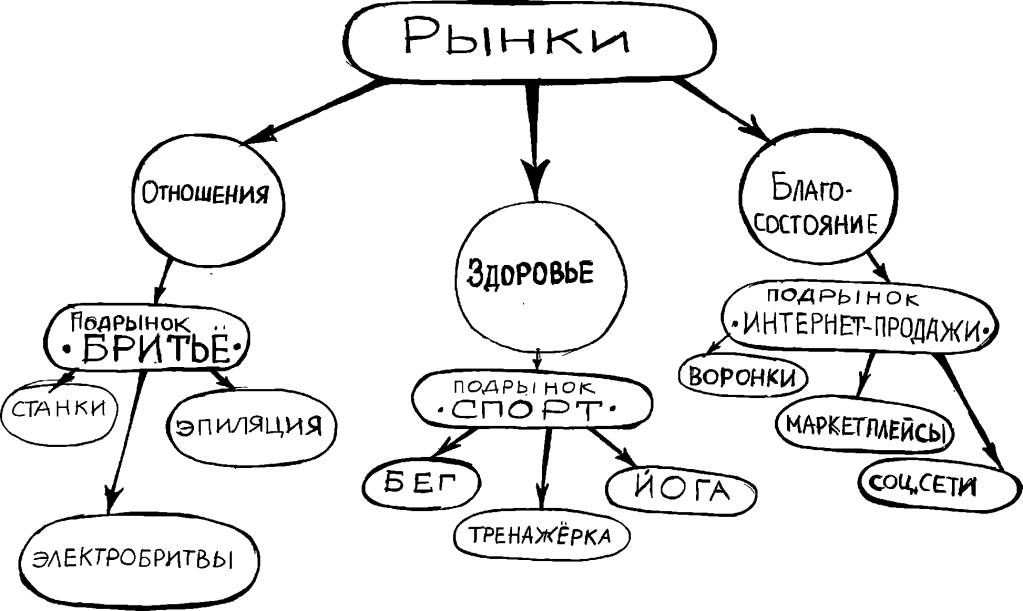 Другой пример. Человек хочет похудеть, чтобы чувствовать легкость в теле и свободно заниматься физическими нагрузками. Чтобы чувствовать себя здоровым. То есть на рынке здоровья существует подрынок снижения веса. И множество ниш: лечебная физкультура, йога, коррекция питания, специальные диеты и так далее.
