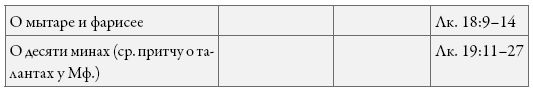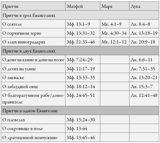 Как явствует из этой таблицы, наибольшее количество притч содержится в Евангелиях от Матфея и Луки, меньшее – в Евангелии от Марка.