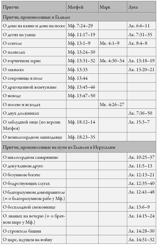 В той или иной мере каждая из притч может быть отнесена либо к одной, либо одновременно к двум и более категориям. В то же время любые попытки классифицировать притчи по содержанию оказываются уязвимыми по той причине, что лишь самые короткие притчи содержат один образ и, следовательно, одну тему. Есть притчи с двумя или тремя главными темами; есть притчи с одной главной и одной или несколькими побочными. К. Бломберг предлагает классифицировать притчи по следующим категориям: 1) простые притчи с тремя основными темами; 2) сложные притчи с тремя основными темами; 3) притчи с двумя основными темами; 4) притчи с одной главной темой[51]. Однако такая классификация также весьма условна, поскольку количество тем в притче по-разному определяется учеными: в одной и той же притче кто-то может увидеть лишь одну тему, а кто-то – две или более.