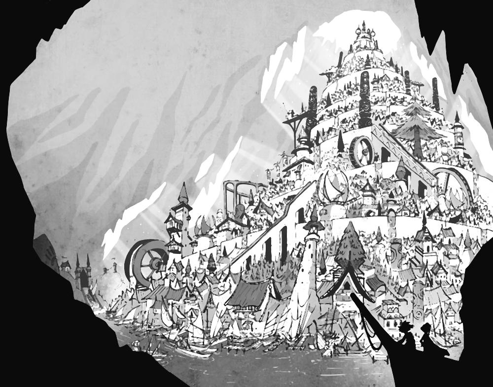Забудьте про пещеру, которую они только что покинули, – целая гора была пуста внутри, и на огромном свободном пространстве расположилась самая большая, самая потрясающая крепость из всех, какие Эш мог вообразить. До головокружительных высот вершины спящего вулкана поднимался величественный многоуровневый город. Лавы, к счастью, нигде не было видно. Размеры каменных зданий, дворцов и шпилей поражали воображение, и всё было искусно украшено резьбой, плиткой и поросшими мхом колоннами. Ослепительный свет струился внутрь горы через огромные отверстия в её стенах, освещая толпы людей, которые сновали по высоким улицам. Огромное пространство пересекали мосты и эстакады, а по каналам, которые расходились во все стороны, как ветви деревьев, лениво дрейфовали лодки.