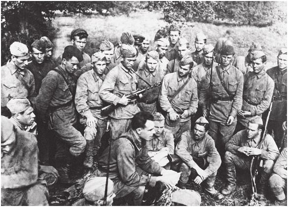 Фото 7. Бригадный комиссар Брежнев на собрании солдат, 1942