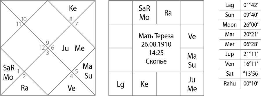 Тереза Калькуттская ро-дилась 26 августа 1910 года в 14:25 в городе Скопье в Македонии. Лагна Стрелец, лагнеша Юпитер соединен с Меркурием в 10-м доме в знаке Девы, ретроградный Сатурн соединен с Луной в накшатре Бхарани в 5-м доме, Раху экзальтирован в 6-м доме, Венера стоит в 8-м доме, Солнце в знаке Льва соединено с Марсом (опять выраженный Марс), а Кету располагается в 12-м доме.