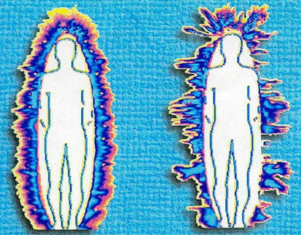 Аура здорового человека (слева) – целая, и человека с отклонениями или заболеваниями (справа – разорванная