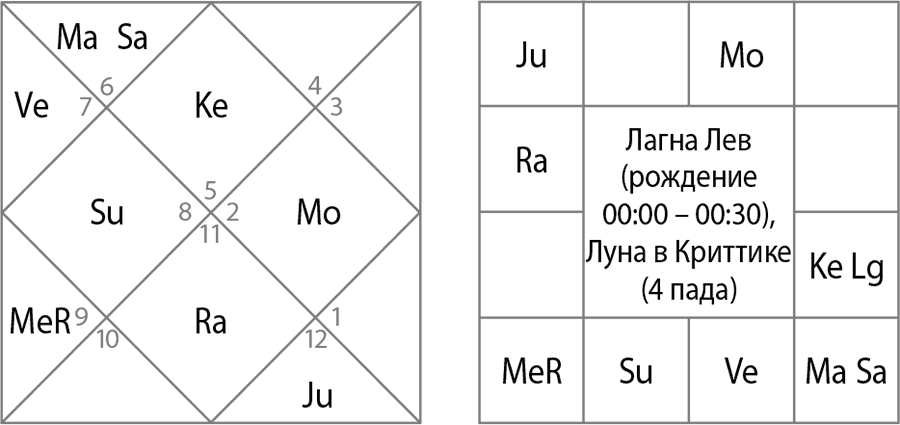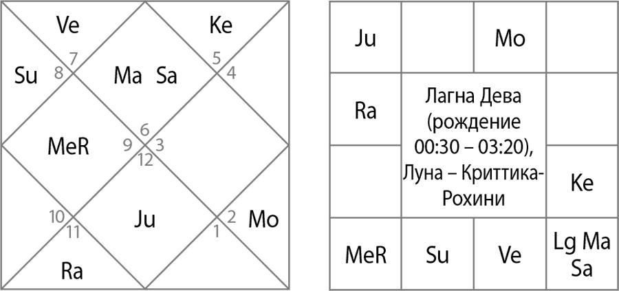 Лагна Дева (см. рис. 2) тоже не отвечает критериям нашего выбора, потому что здесь ретроградный хозяин 1-го и 10-го домов находится в 4-м доме, нет сильных позиций для литературной деятельности и путешествий. Даши также не показывают путешествия: Раху в 6-м доме вряд ли дал бы ему такие успешные экспедиции, Юпитер хоть и мог быть хорошим периодом для путешествий, то Сатурн, как хозяин 5-го и 6-го дома, находящийся в соединении с хозяином 8-го дома (и это планета Марс), вряд ли дал бы принятие сана. То есть здесь мы видим поражение лагны и слабые 1-й и 10-й дома, поэтому и лагна Дева нас не устраивает.