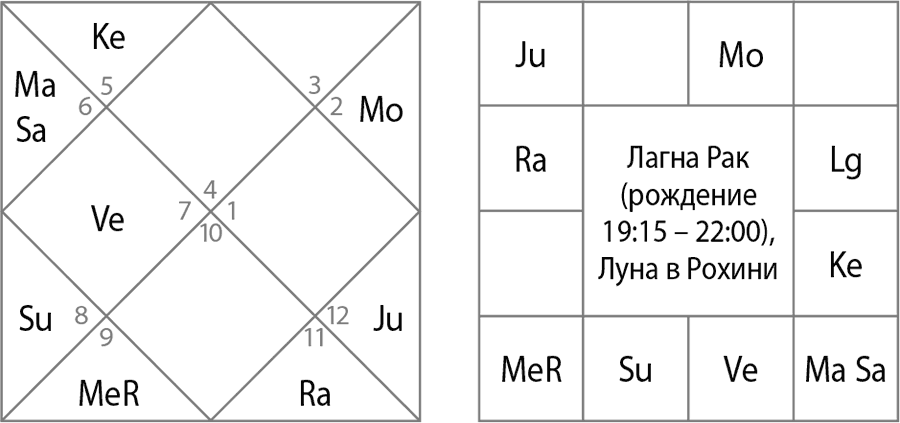 Лагна Телец (см. рис. 10). В лагне – Луна, а хозяйка 1-го дома Венера расположена в 6-м, есть поражение домов дхармы и слабо выражены дома путешествий. Эта карта не соответствует выбранным критериям.