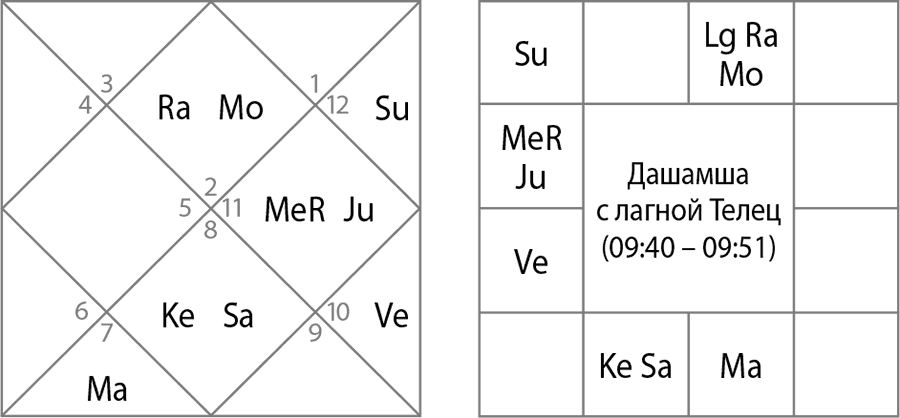 Дашамша с лагной Телец (09:40 – 09:51, см. рис. 19). Экзальтированная Луна в соединении с Раху в 1-м доме; хозяин 8-го и 2-го домов в 10-м доме – отвергаем и эту дашамшу по тем же соображениям, что и предыдущую.