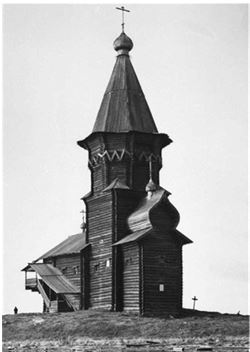 Историки архитектуры не без основания предполагают, что прототипы «бочек», «шатров» и бревенчатые «клети башенной формы» зарождались во второй половине I тысячелетия нашей эры в дохристианской культовой архитектуре.[22] В Средние века деревянные храмы с их костровидными куполами, пламевидными завершениями кровли, приделов и крылец возводились под влиянием незабываемо ярких предхристианских образов. Впоследствии к этой основе добавили боковые прирубы, алтарную преграду, гульбище, высокое крыльцо, оконца с наличниками и многоглавие, означавшее святость храма и небесную защиту всех его частей (хотя, в первую очередь, купола воздвигались над церковными алтарями).