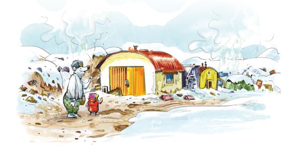 И в самом деле, чем дальше они шли, тем сильнее становился душок, напоминающий одновременно запах мусора, топлива и грязных ног. Вдали показалась длинная взлётно-посадочная полоса, почти полностью засыпанная снегом. Вдоль неё тянулись заброшенные ангары. Их железные стены проржавели, а за остатками дверей виднелись груды металлолома. А вокруг – какие-то очень подозрительные бугорки, покрытые снегом и ягелем. Они-то и издавали неприятный запах.