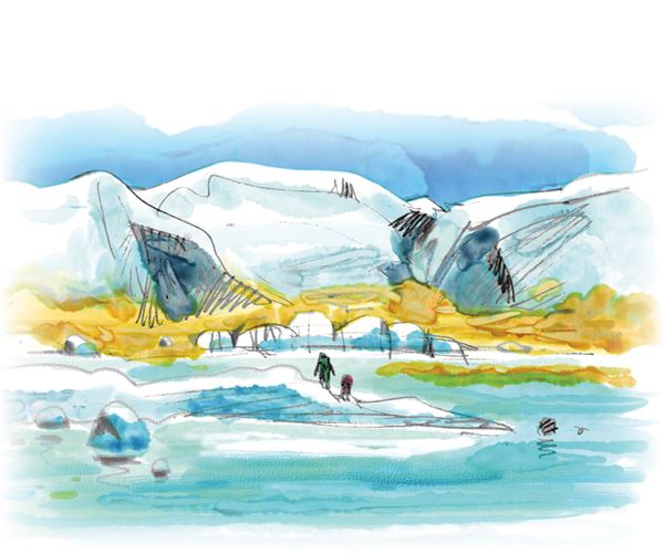 Вокруг становилось всё пустыннее: на горизонте вырисовывался зубчатый гребень ледника Брор. Одинокое стадо северных оленей устроило пикник и с аппетитом жевало травинки и едва появившиеся крошечные цветы, белые и жёлтые.