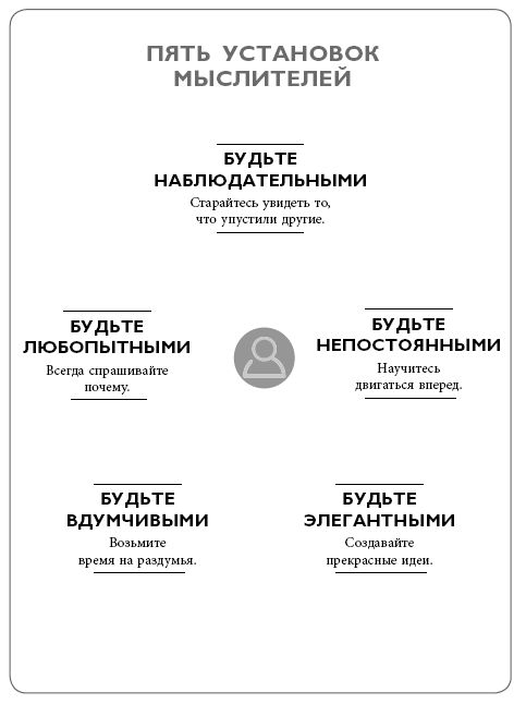 Моя одержимость неочевидным мышлением в течение последнего десятилетия привела меня к изучению менталитета сотен мыслителей, бизнес-лидеров и авторов книг. Многие из этих руководителей стояли за инновациями, изменившими индустрию, и все они были невероятно успешны. Помимо менталитета роста, я обнаружил пять дополнительных установок мышления, которые эти мыслители использовали, чтобы быстрее остальных продвигаться самим и приближать свои организации к будущему.