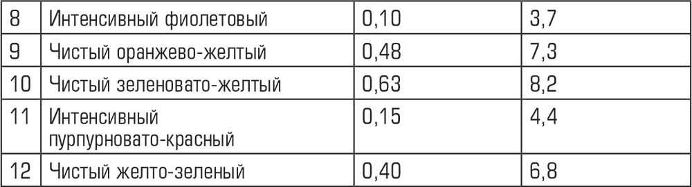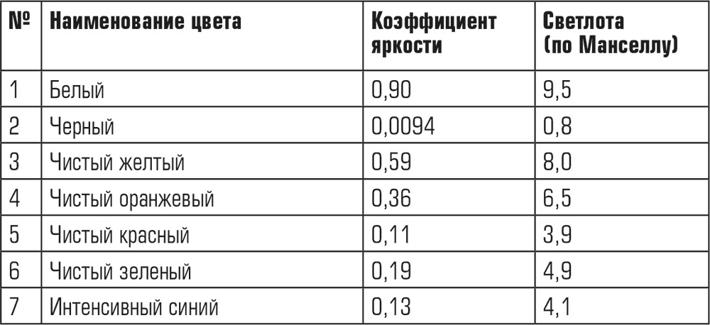 Значения светлоты (яркости) белого, черного и основных хроматических цветов приведены в табл. 2.