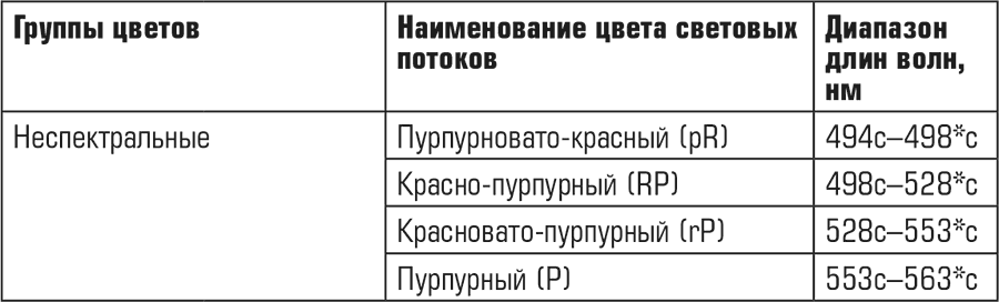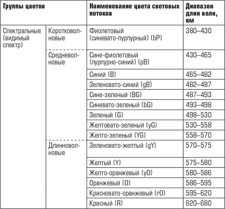 В табл. 1 приведены наименования цвета монохроматических световых потоков, их условные буквенные обозначения и диапазон длин волн [1].