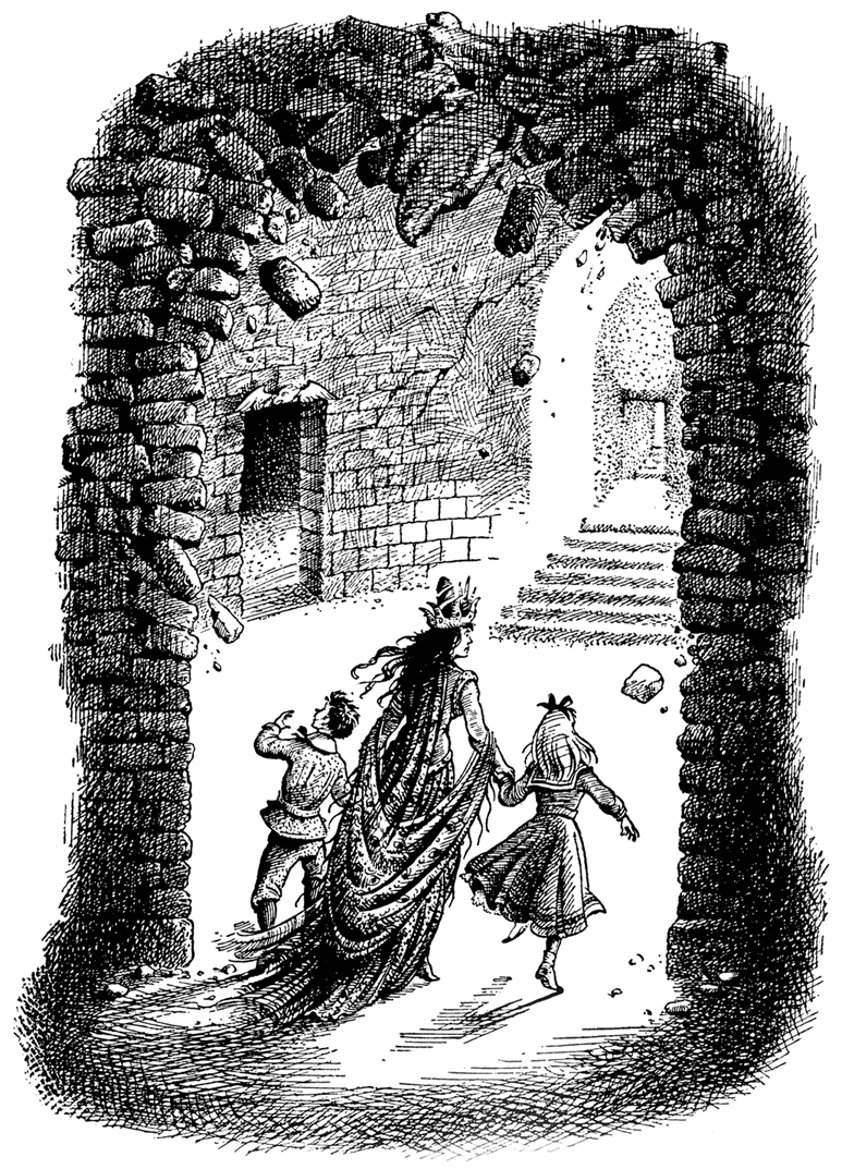– Тут оставаться нельзя, – совершенно спокойно сказала королева. – Дворец скоро рухнет. Идёмте. – И протянула одну руку Дигори, другую – Полли.