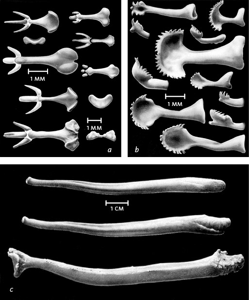 У полевок, хлопковых крыс и ондатр (a) длина кости полового члена – около шести миллиметров. У бурундуков (b) эта кость чуть длиннее, у медведей и морских львов (c) ее размер достигает пятнадцати сантиметров, а иногда намного больше