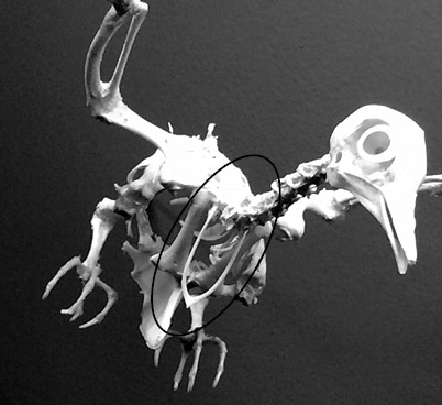 На скелете голубя видны кости, которых нет у людей: вилочка (обведена) и плоское кольцо в каждой глазнице