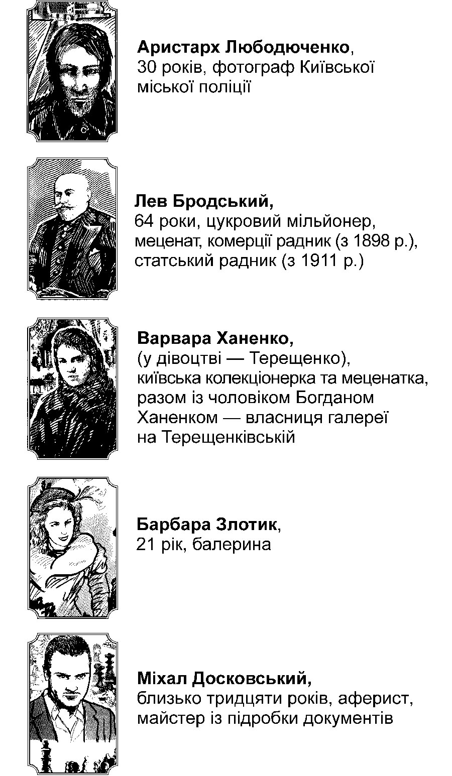 Він крокує до хвіртки, чує, як рипить сніг, а здається, що рипить картотечна шафа у кімнаті Естер. То сентиментальна звичка відлюдника – прислухатися до тужливого рипіння старих меблів чи боятися збудити друкарську машинку необережним рухом. Невже зараз вона жене Тараса Адамовича на місце вбивства? Саме тепер можна все оглянути до прибуття поліції – таке випадає слідчому у відставці не часто. Випадковостями не варто нехтувати. Навіть якщо потім він перекаже все побачене слідчим, зараз має принаймні подивитися на вбитого. Вони не були друзями, навряд чи могли вважатися близькими сусідами – червонодеревник жив за кілька хат від будинку Тараса Адамовича. Однак цієї хвилини він чомусь думав про акуратні невеликі шухляди власної шафи, й це викликало дивне бажання пришвидшити ходу. «Старому Нечипоруку» було не більше ніж сорок п’ять років, то лише для Костя всі, хто був старший за Якова Менчиця, видавалися старими. Може, поліція вже вирушила сюди? Колишній слідчий на мить прикрив очі повіками, уявив, як жандарми ліниво чекають на сходах будинку по Володимирській, 15, начальник розшукової частини Київської міської поліції, Олександр Семенович Репойто-Дуб’яго думає, кому б передати справу, помічає свого заступника Івана Арчибальдовича Фогля, який прогулюється коридором зі своєю кривою усмішкою на вустах, зупиняє його зі словами: