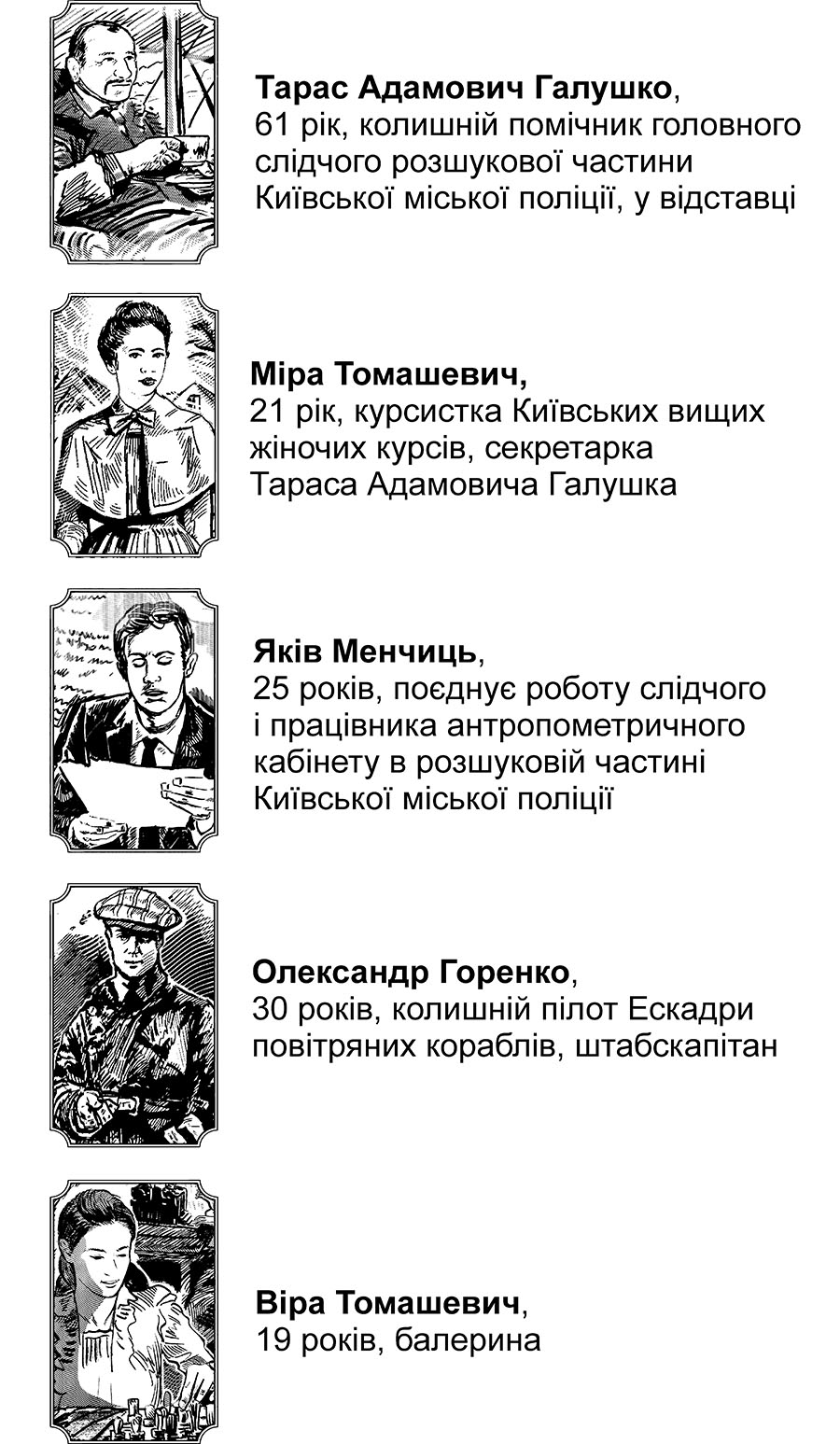 Відігнавши спогад, старий слідчий вправним рухом дістав чорну валізку слідчого з-під столу, вже у сінях надяг пальто, надів трохи прим’ятий капелюх та вийшов на поріг. Морозно. Тихо. Сніг сяє на сонці діамантами. Не дивно, що Міра Томашевич так любить дивитися на нього у цьому саду. Невже він зараз хоче втягнути дівчину в ще одну справу? Нехай у курсистки мають бути канікули на свята, але ж не гоже витрачати такі дні на те, щоб вислуховувати роздуми старого слідчого у відставці, коли у Шато де Флер відкривається ковзанка, оркестр грає вальси, а у кав’ярнях на Хрещатику подають тепле вино. Її сестра точно не сидітиме в чотирьох стінах у ці дні, хоч вона й обіцяла продовжити їхнє шахове протистояння. Балерина швидко забуває обіцянки, або просто не вважає недбало кинуті репліки такими.