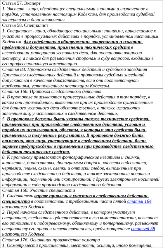– Про специалиста, протокол следственного действия, там про применение технических средств говорится, а еще про осмотр и протокол осмотра, – наперебой затараторили ребята.