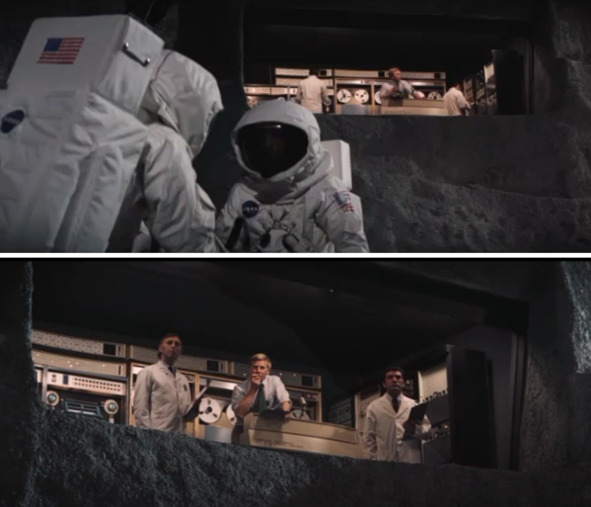На кадрах, расположенных выше наблюдается огромная ЭВМ, которая, вероятно, контролировала все процессы фальшивого лунного полета. Об этом устройстве упоминают многие американские скептики, критики Лунного Обмана США. Богатому аферисту, который фигурирует в этом фильме, как некий «Доктор Зло», такая система не нужна. Скорее всего, это опять намек на известное Агентство, которое управляло этим процессом осуществления обмана. Хотя речи о НАСА в фильме вообще нет. По сюжету фильма в огромном ангаре находится частная фирма. Там и осуществляется «лунная прогулка» с двумя актерами. Несомненно, это не тренировка. В фильме изображена киноплощадка с декорациями. Например, декорация с изображением лунных гор выполнена из фанеры, из длинных брусков.