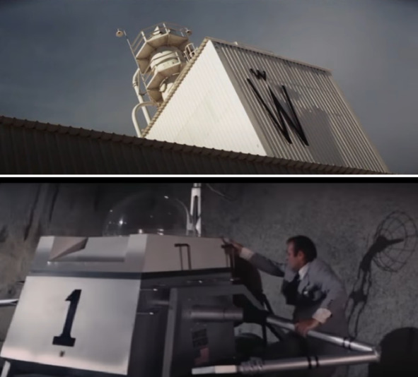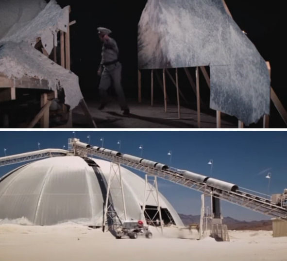 Ангар хорошо охраняется охранниками в неизвестной форме. Там существует пропускная система, где сотрудники имеют огнестрельное оружие. Сам ангар авторами фильма был показан в виде большого полусферического помещения. Авторы фильма показали две конструкции, похожие на систему подачи грузов сверху. Необходимо отметить, что при «тренировке» актеров на киноплощадке отсутствовал рыхлый грунт, В лунном шоу США присутствовало большое количество серого песка. Его, если киноплощадка была большой, необходимо было доставлять в большом количестве вагонетками. Они и попали в кадрах. Создатели фильма снимали эти кадры в то время, когда не было известно о внешнем виде американского лунохода.
