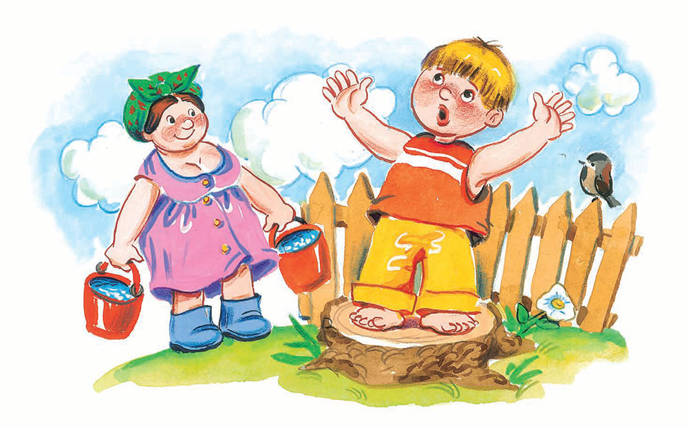 А летом он поехал в деревню. В саду у бабушки был большой пень. Миша залезал на пень и начинал читать бабушке одно стихотворение за другим.