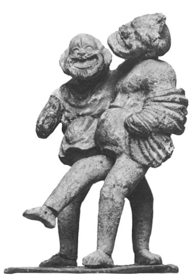 [10] Актеры «древней комедии». Парная статуэтка середины IV века до н. э. Актеры, одетые в трико и туники с толщинками, изображают двух пьяных рабов или просто гуляк.