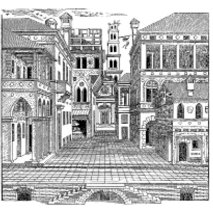 Серлио, автор трактата по архитектуре, вторая часть которого, посвященная театру, была опубликована в 1545 году, стал первым художником, обнародовавшим свои сценические проекты. Три знаменитые перспективные декорации, предназначенные для театра в королевском дворце или в пиршественном зале дома знатного вельможи, предлагали базовую идею, которую в течение последующих четырехсот лет эксплуатировали все европейские сценографы. Эскизы декораций к комедии [53] и трагедии [54] представляют собой перспективы улиц c домами по обе стороны, изображенные на задниках с боковыми створками. На эскизе декорации к сатировой драме [55] (о которой итальянцы знали лишь то, что это был деревенский фарс), изображена сельская местность с деревьями и двумя пасторальными хижинами по краям. Эти изображения положили начало стилю оформления пышных итальянских представлений, чье развитие привело к появлению архитектурной арки просцениума, заменившей собой простой проем в стене, отделявшей игровое пространство от зрительного зала. Описанные проекты оказали влияние на сценическое оформление английского театра масок, испанского придворного театра и французского театра времен Мольера, а также мелодрамы XIX века. Даже когда симметричную перспективу Серлио, усвоенную всеми его последователями, дополнили декорации с угловой перспективой, введенные младшим поколением династии Бибиена [52], прежняя компоновка зданий и деревьев всё еще составляла основу для контрастирующих городских и сельских сцен.