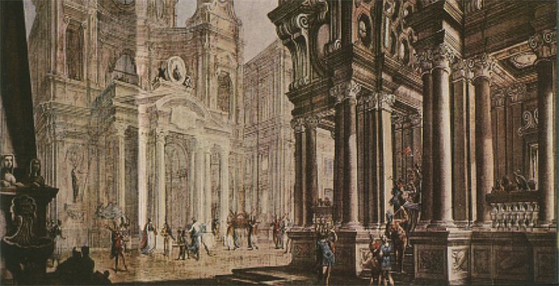 Театр Фарнезе в Парме и «Театр в античном стиле» в Сабьонетте, построенные Скамоцци, – предшественники более поздних европейских оперных сцен. Алеотти или, возможно, его ученик Джакомо Торелли (см. ил. 103) ввели вместо портальной арки, главного атрибута театральной архитектуры эпохи Ренессанса (см. ил. 50), боковые кулисы и задник, тем самым заложив основы стиля оформления оперных и балетных спектаклей, который дожил до середины XX века. Зрительный зал Театра Фарнезе серьезно пострадал во время Второй мировой войны.