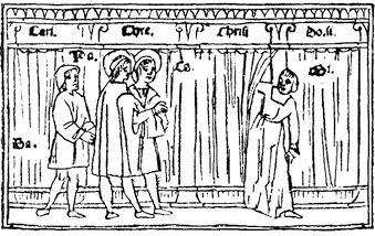Оригинальное смешение античной и средневековой практик: многочисленные домики средневековой сцены, в подражание римской традиции расположения ряда дверей в задней стене (см. ил. 21), сведены всего к четырем секциям. Сценический помост представляет собой платформу на опорах, что отчасти напоминает сцены флиак (см. ил. 22) и комедии дель арте (см. ил. 69).