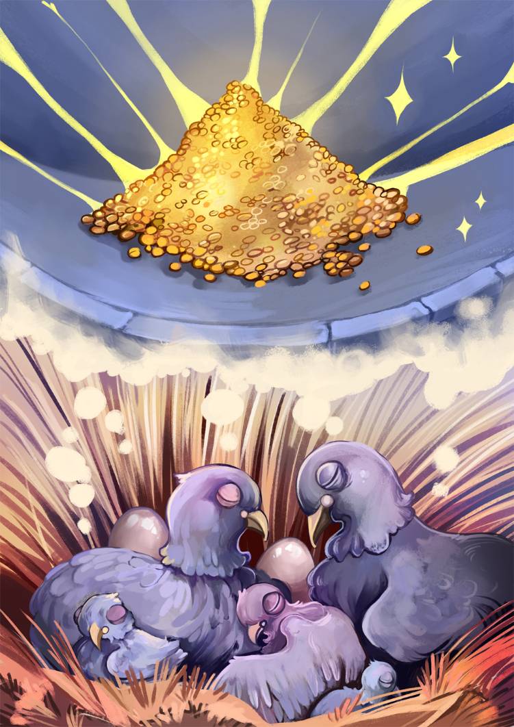 В это время вернулись родители и принесли деткам немного зёрнышек. Обычно они кормят их раза три-четыре за день. Поэтому у маленьких сейчас был обеденный перерыв. Неравнодушные люди подкармливали голубей на трамвайной остановке: кто пшена насыплет, кто хлебных крошек принесёт. А когда-то их предки жили в гористой местности, строили себе гнёзда в горах и каждый день могли любоваться на море. Городские голуби могли только мечтать об этом. Но они совсем не знали историю своих предков, поэтому даже во сне видели трамвайную остановку и большие горы пшена.