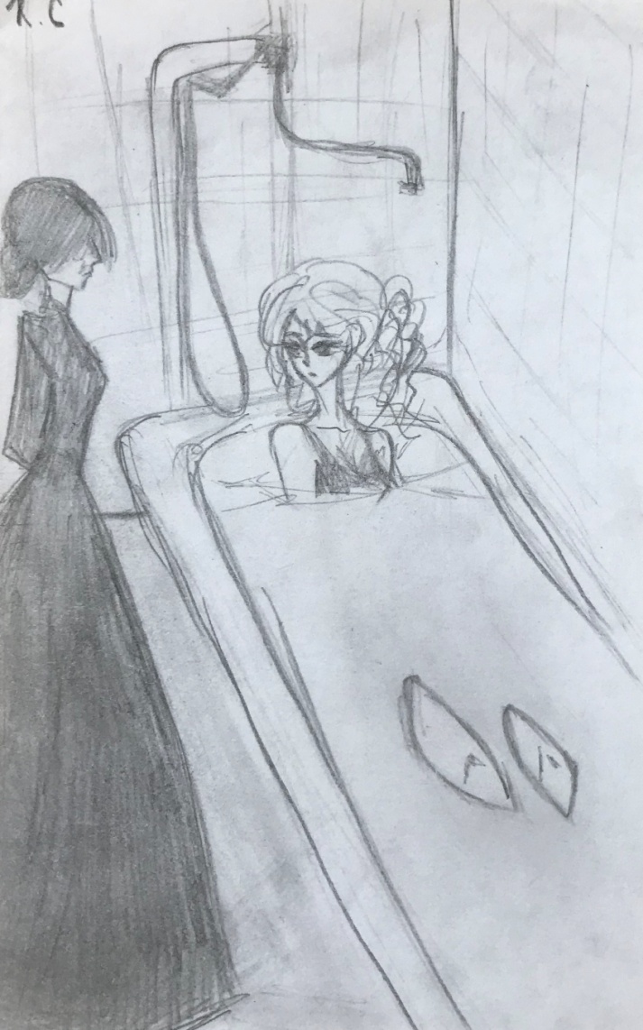 Наконец Лиза открыла глаза. Голова продолжала гудеть, но немного поменьше. Глаза слиплись и елё открылись. Лиза тут же захотела встать, так как ей было холодно. Но до конца открыв глаза и увидев всё, поняла, что лежит в ванной полной ледяной воды. Но она была не прозрачная. В ней как будто было нарезанное мыло, и вода от этого имела телесный бледный цвет. Ноги размякли, и пошевелить ими девочка не могла. На них что-то лежало. Что-то твёрдое. Что-то тяжёлое. Лиза попыталась встать, но ноги не поднимались.