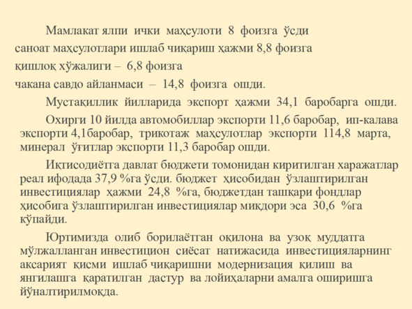 «Турар жой биноларини қуришда энергия тежайдиган қурилиш материалларининг янги турларидан кенг фойдаланилади. Уйда қишлоқларда улар 5—7 қаватда, шаҳарларда 12-16-18 ва ҳатто 30 қаватда қурилади», – деди у. Ўзбекистонда бюджет, молия ва пул-кредит соҳасидаги ислоҳотлар давом эттирилади. Aввало, молия ва пул-кредит сиёсатини мувофиқлаштириш яхшиланади.