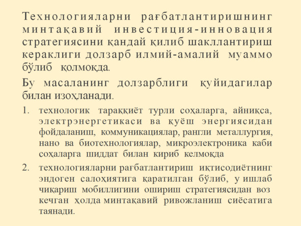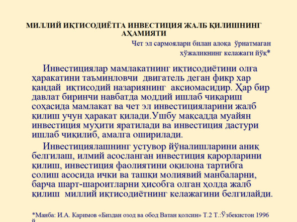 Иқтисодиётни модернизация ва диверсификация қилишда инвестицияларнинг тутган ўрни