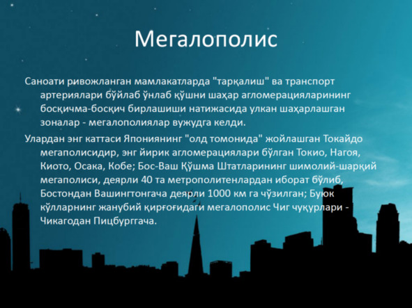 Шу сабабли, бугунги кунда урбанизациялашган ҳудудларда содир бўлаётган жараёнларни таҳлил қилиб, агломерация шароитини эътиборсиз қолдириб бўлмайди.