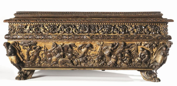 В XVI столетии ясную композицию кассонов заменили скульптурными решениями. Лучшие образцы были созданы в Риме. Под влиянием изделий из мрамора сундуки получили форму, напоминающую саркофаг61. Стенки покрывались очень разнообразным, динамичным узором, выполненным в технике глубокой резьбы. Мастера начали активно применять мотивы гротеска, особую популярность приобрели изображения тритонов и нереид (это связывалось в науке с влиянием на стиль сундуков изображений морских существ на античных саркофагах62). Часто мастера обращались к сюжетам из римской истории, Библии, античной мифологии. Основная сцена помещалась на передней стенке, боковые украшались второстепенными сценами или оформлялись различными декоративными мотивами. Фон часто золотился, при этом он хорошо сочетался с темно-коричневым цветом вощеного дерева (передние и боковые стенки – накладные, т.е. не несут конструктивную нагрузку). Крышка богато профилировалась.