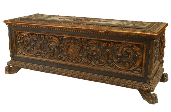 В Италии делались не только сундуки, но и их «дериваты», например, кассапанка (cassapanca), которая является по сути слиянием сундука и скамьи. Этот сундук, снабженный спинкой и ручками, впервые появился в Северной Италии, а затем, в начале XV века, начал делаться в Тоскане76. Такие предметы имели очень разнообразные художественные решения, которые, как правило, находились в рамках основных стилевых течений. Для примера можно назвать флорентийские и североитальянские кассапанки XVI века из коллекции Эрмитажа, богато декорированные резным орнаментом, типичным для своего времени77. Такие вещи производились итальянскими мастерами на протяжении весьма длительного периода. В собрании музея Уффици находится кассапанка II половины XIX века, украшенная геометрическими и растительными мотивами, розетками и маскаронами78. В XX столетии делались треугольные кассапанки, состоящие из двух частей.