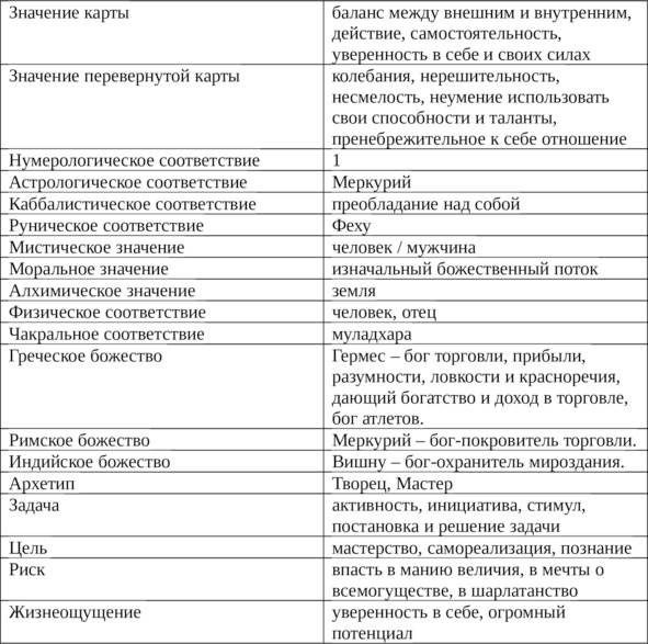 Маг – мастер игры, ремесленник по жизни. Его потенциал всегда приносит ему плоды. Он властвует над эмоциональным и физическим мирам, подобно ребенку, над которым довлеют первичные инстинкты тела и чувств. На столе у него находятся символы эмоционального и ментального планов, при помощи которых он должен научить развивать свою сущность и претворять свою судьбу. Шляпа Мага являет собой символ вечного возобновления. Маг связан с идеей совершенства, которому суждено воплотиться. Карта Маг имеет порядковый номер 1, это единство, первосущность, изначальный облик любой вещи. Это есть рождение.