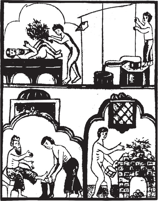 Иллюстрация 5. Эта миниатюра XVII века изображает основные элементы устройства бани: раздевалку, горячую печь, откуда исходит жар и пар, и скамью, на которой молодой человек хлещет веником человека постарше.