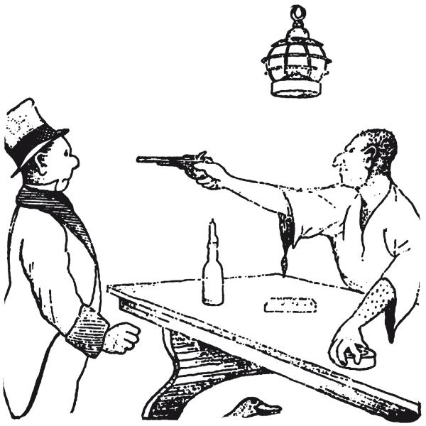 Лікар на мить відсахнувся, поглянув на дуло пістолета, не знаючи, що робити далі. Вілкінз, ні на секунду не відводячи очей від Лікаря, лівою рукою закрив шкатулку з перлинами і засунув її в кишеню.