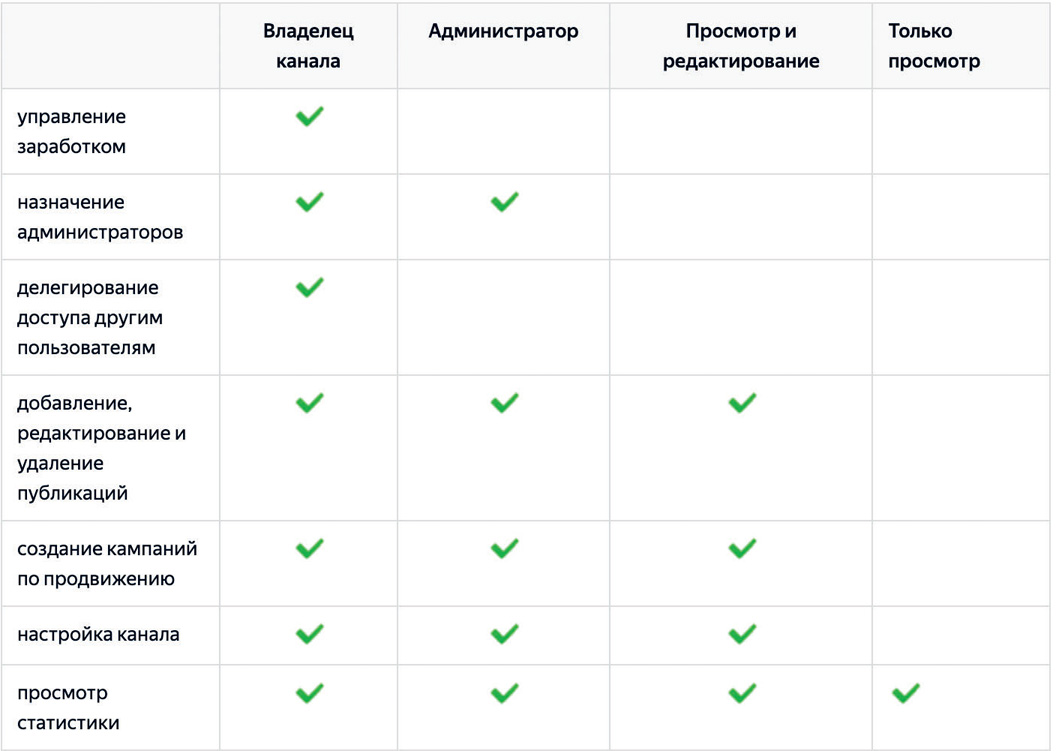 Что дают разные типы доступов. Источник – справка Яндекс. Дзена