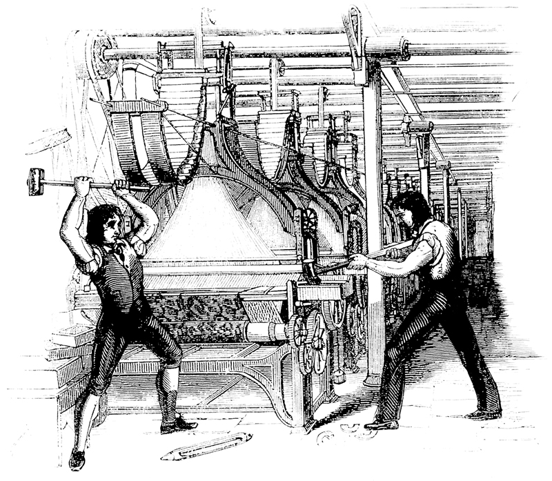 «Подрывное влияние машин на социальную экономику и положение трудящихся осуществляется в тысячах способов, которые все взаимосвязаны и одинаково называются: увольнения, сокращение зарплат, перепроизводство, затоваривание, порча продукции, банкротства, выдавливание рабочих из их класса, вырождение вида и, наконец, болезни и смерть».