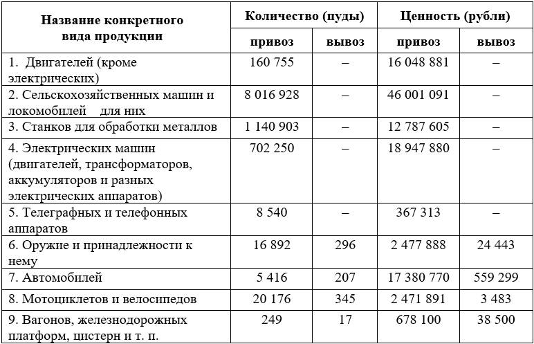 В заключение приведем еще некоторые сокращенные статистические данные, которые Г.А. Крестовников присовокупил к своей записке в качестве приложений, по привозу и вывозу машин, аппаратов, автомобилей, оружия и других предметов механической промышленности: