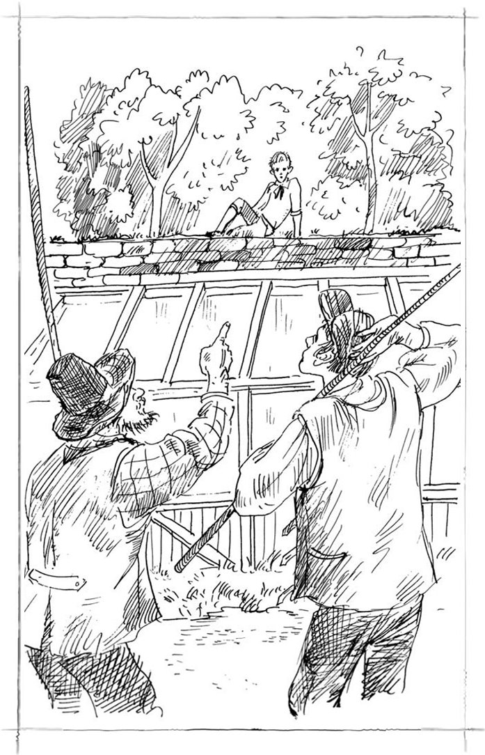 Садовник и его помощник обомлели при виде неожиданного зрелища: по крутой крыше оранжереи, примыкавшей к стене, карабкался босой мальчуган в рубашке и панталонах. Добравшись до высокой стены, он спокойно уселся на ней.